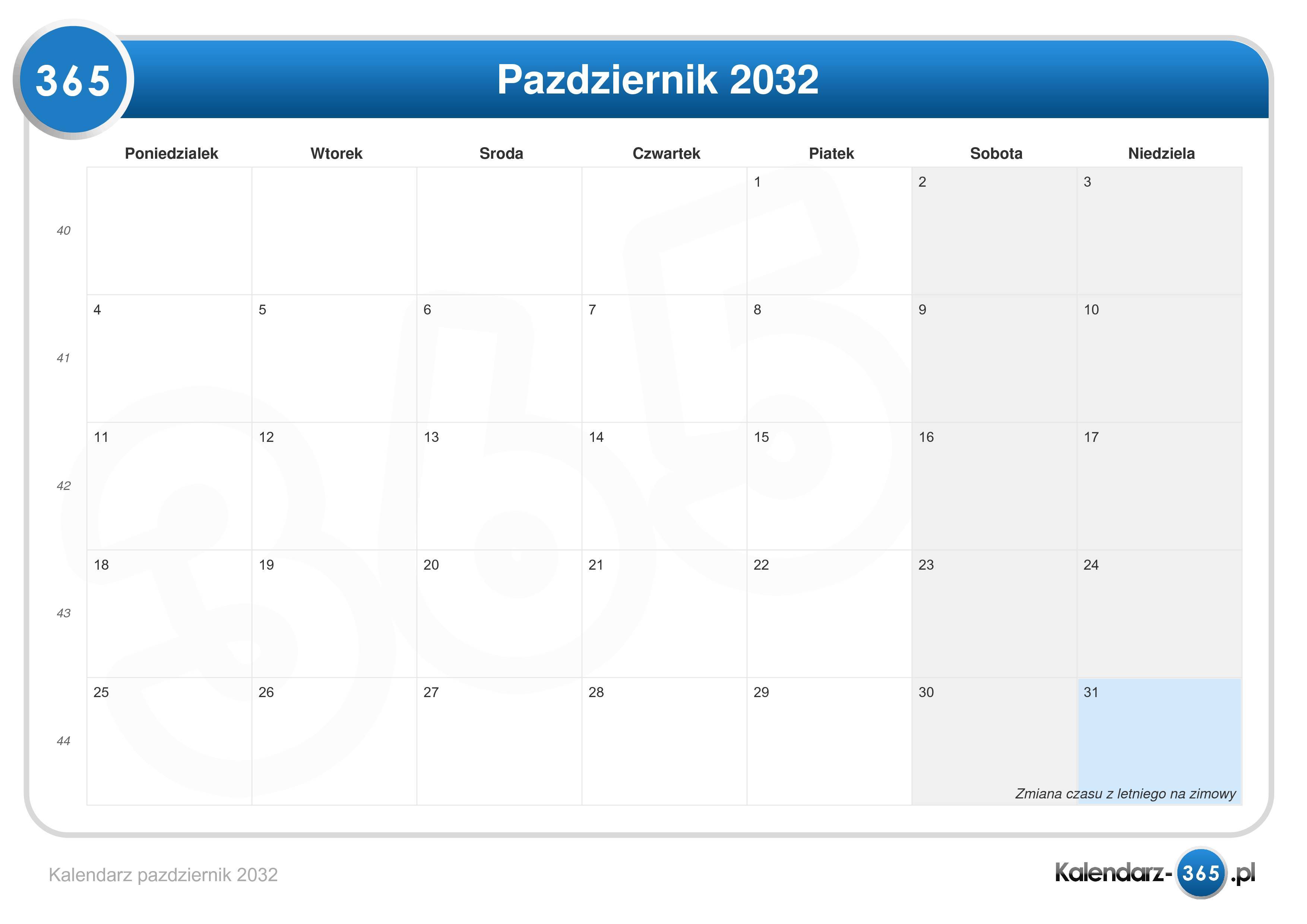 Kalendarz październik 2032 (Format leżący)Przejdź do Kalendarz 2032.
