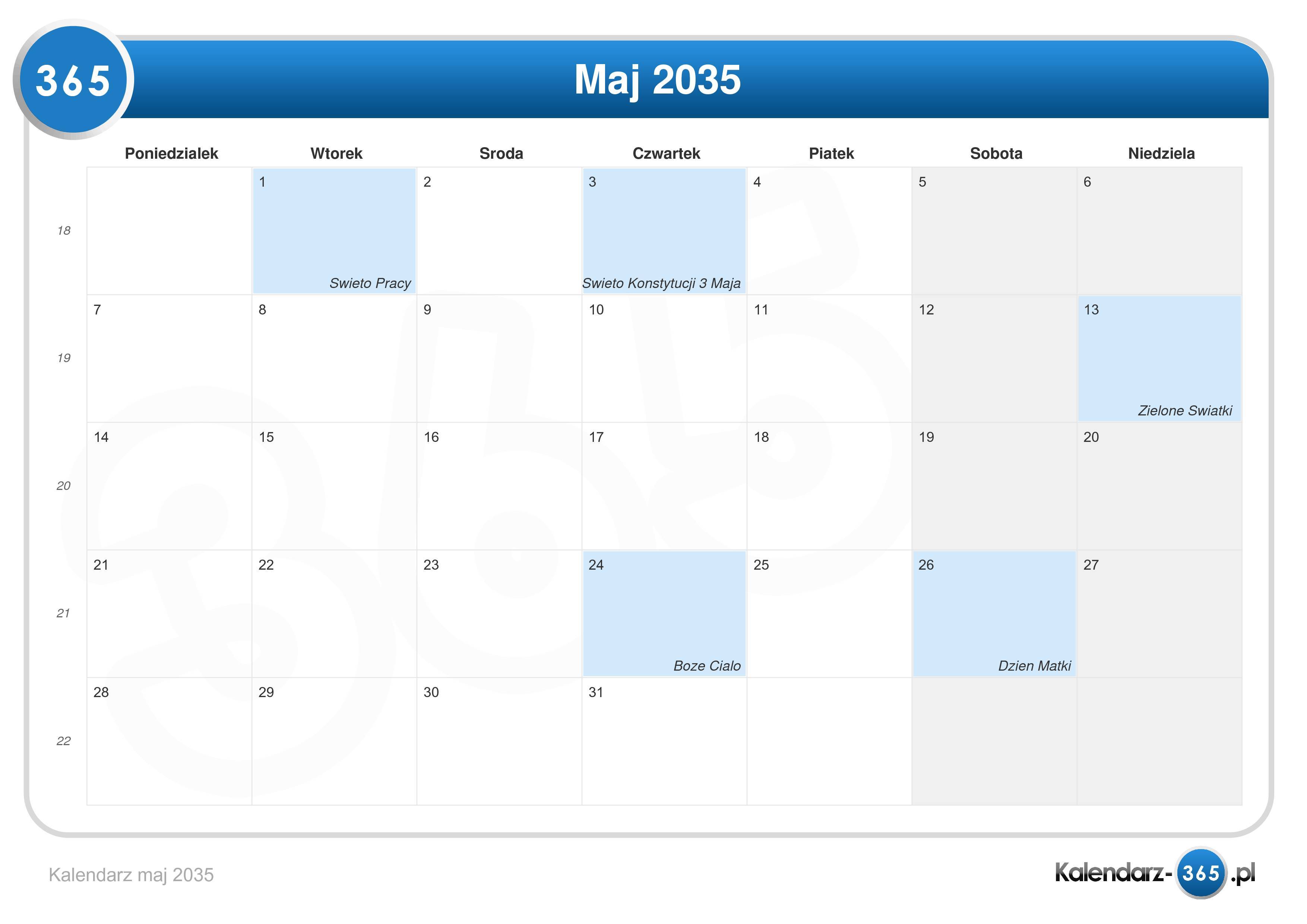 Zobacz tutaj kalendarz miesięczny maj 2035 łącznie z numerami tygodni.| 1 maja | Święto Pracy |