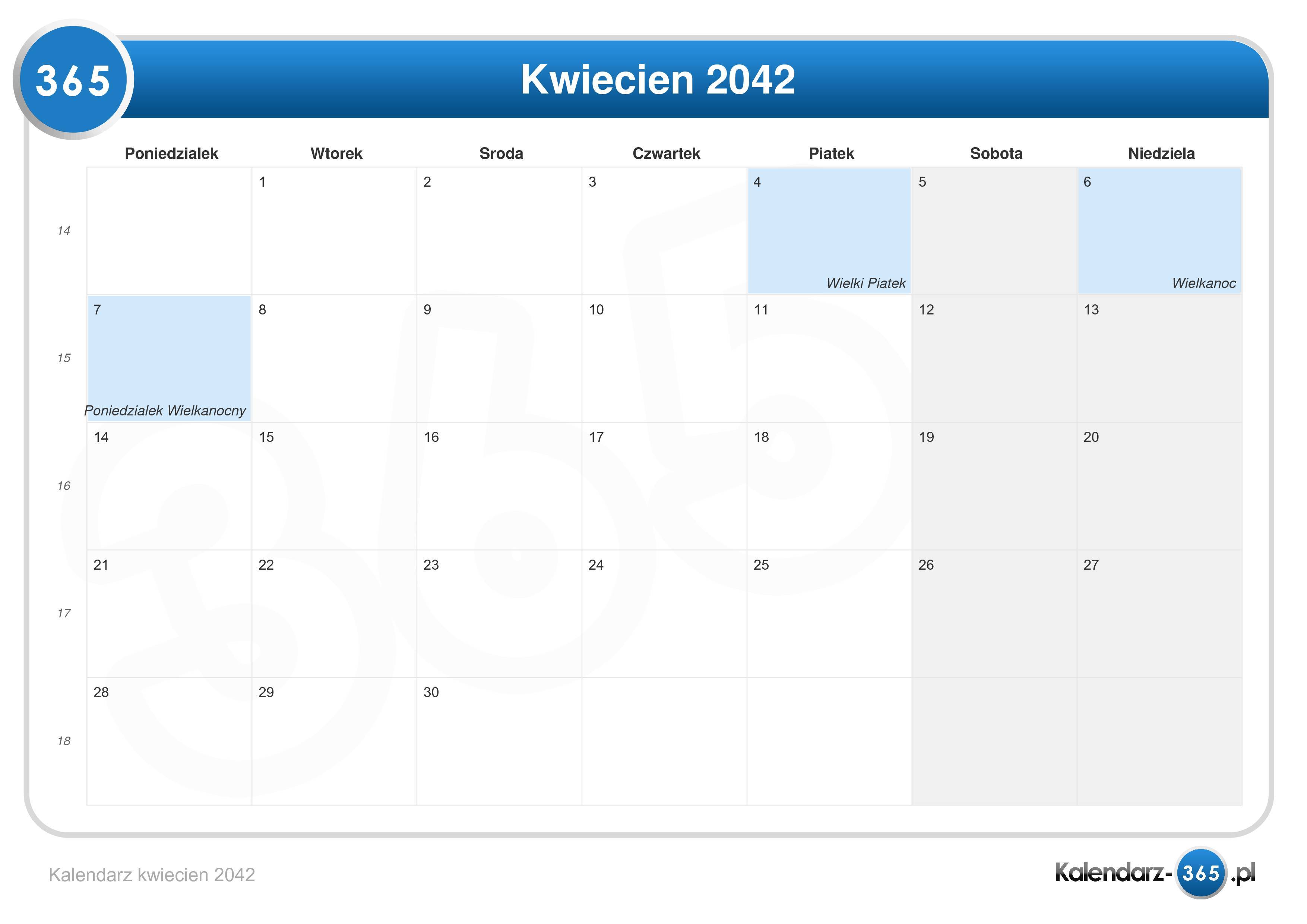 Kalendarz kwiecień 2042 (Format leżący)Przejdź do Kalendarz 2042.