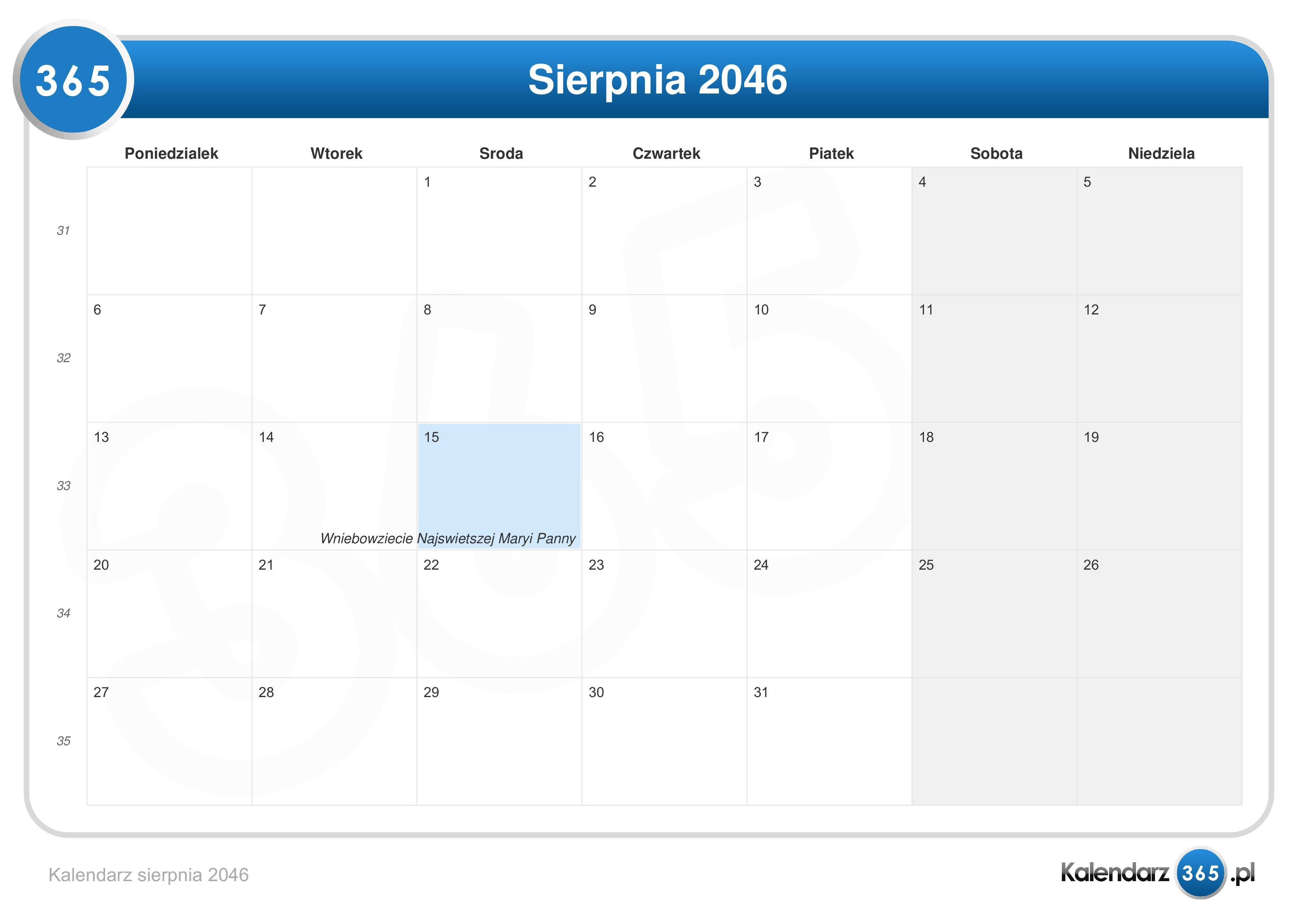 Kalendarz sierpnia 2046 (Format leżący)Przejdź do Kalendarz 2046.