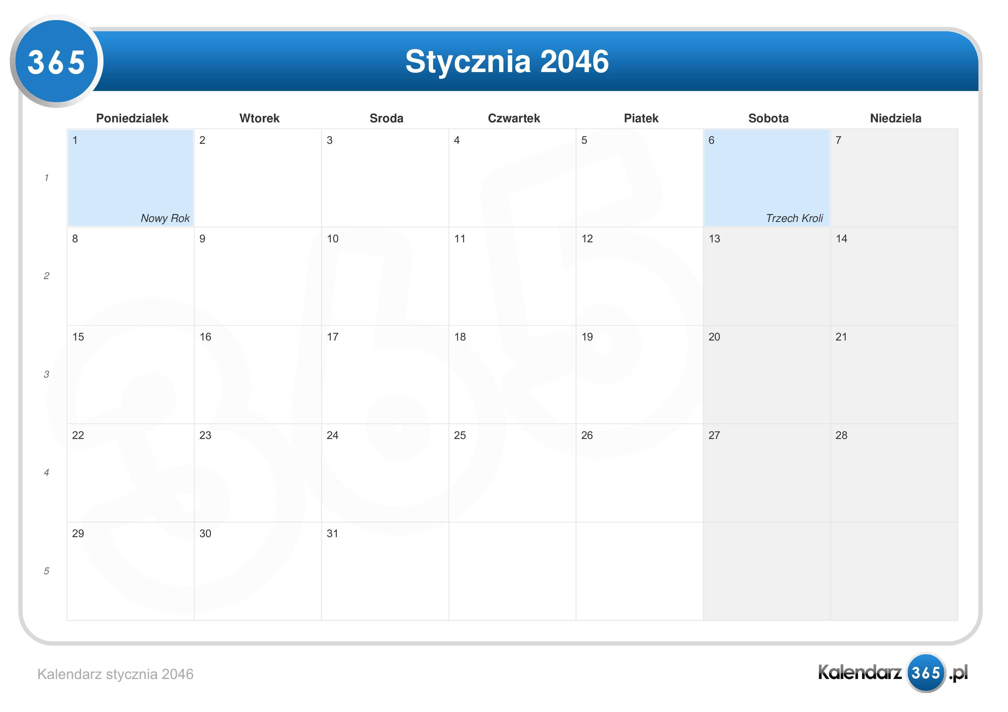 Zobacz tutaj kalendarz miesięczny stycznia 2046 łącznie z numerami tygodni.| 1 stycznia | Nowy Rok |